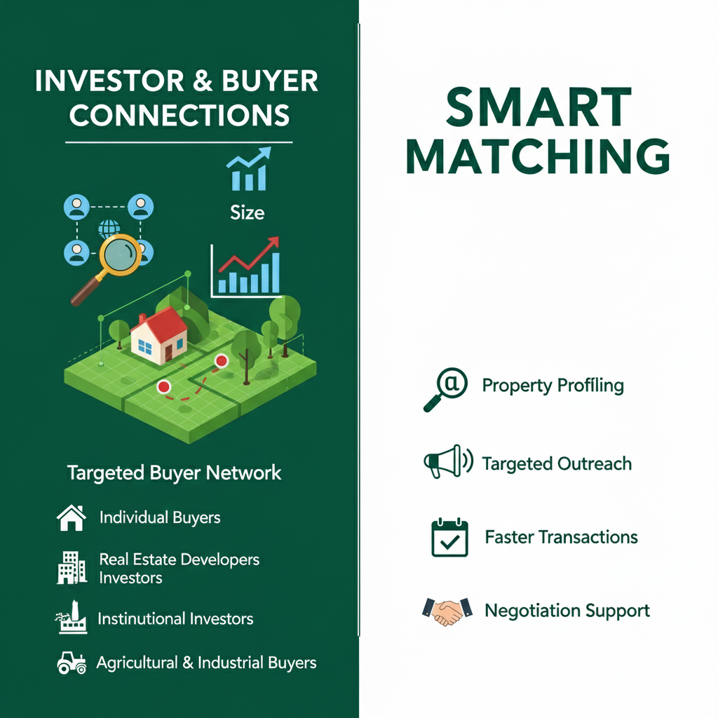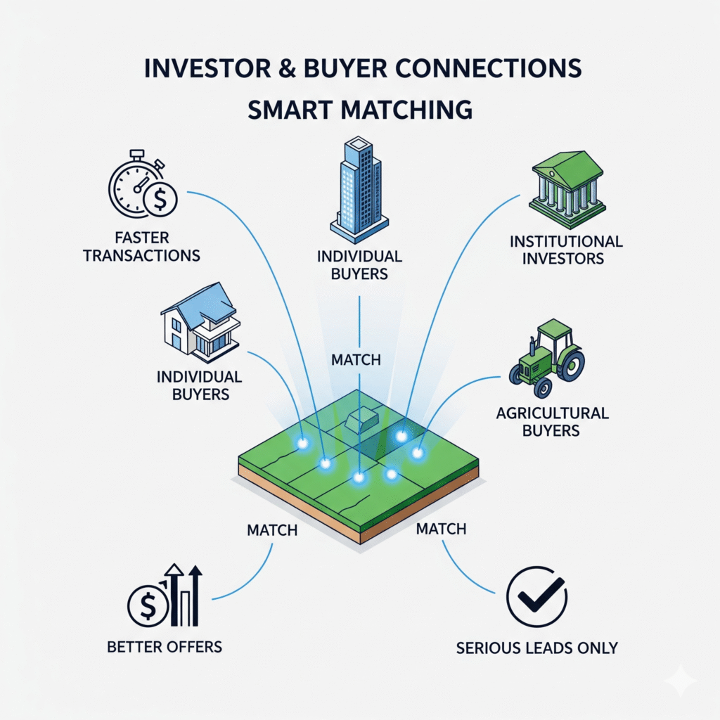 Finding the right buyer or investor can be the most challenging part of selling land — we make it effortless. Our Investor & Buyer Connections service links landowners with a qualified network of investors, developers, and buyers who are actively seeking properties like yours.
